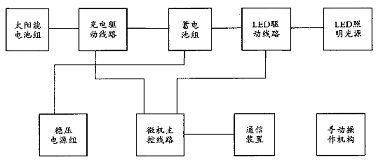 太陽能路燈微機(jī)監(jiān)控系統(tǒng)由微機(jī)主控線路、太陽能電池板、蓄電池充放電器、蓄電池組、LED光源驅(qū)動和LED燈等幾部分組成。系統(tǒng)組成結(jié)構(gòu)如圖1所示: