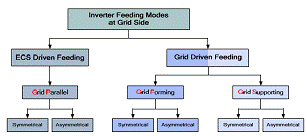 在ECS驅(qū)動饋電時,ECS決定了向電網(wǎng)傳輸?shù)墓β?。如今,單臺RESs逆變器典型地就在這種饋電方式下運(yùn)行,并向電網(wǎng)注入全部可提供的功率。在電網(wǎng)驅(qū)動饋電時,不再是ECS,而是電網(wǎng)決定功率的傳輸。典型的,大多數(shù)常規(guī)大型電廠運(yùn)行在這種方式下,同樣,這種方式潛在的適合DERs和RESs系統(tǒng),或者至少適合混合式電力系統(tǒng)。在ECS驅(qū)動饋電的情況下,逆變器控制方式被稱作電網(wǎng)平行方式。第二種情況可以被兩種不同的逆變器控制方式實現(xiàn),分別是電網(wǎng)形成方式和電網(wǎng)支持方式。電網(wǎng)形成方式中逆變器的作用是建立和維持電網(wǎng)狀態(tài)變量。電網(wǎng)支持方式中逆變器被用于平衡功率。它可以傳輸預(yù)先設(shè)定數(shù)量的功率,這個數(shù)量可以根據(jù)電力系統(tǒng)的需要或者高級控制運(yùn)行得到的參考值進(jìn)行調(diào)整。應(yīng)用這個控制方式的逆變器例子如圖3至圖5的左側(cè)所示。此外,這些基本有功功率調(diào)控器潛在的對二次電網(wǎng)控制的相互聯(lián)系可以被類似的闡釋。