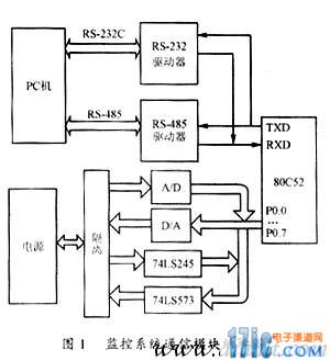 為了組建開關電源監(jiān)控系統(tǒng),系統(tǒng)中的每臺電源配置了一個獨立的監(jiān)控系統(tǒng)通信模塊。監(jiān)控系統(tǒng)通信模塊采用的控制芯片是MCS51系列單片機80C52。80C52具有8k的內部ROM和256字節(jié)的內部RAM。監(jiān)控系統(tǒng)通信模塊電路結構圖如圖1所示。計算機通過該通信模塊可以實時讀取電源的輸出電壓、輸出電流值以及輸出過壓、輸入過壓、輸入欠壓、過流、過熱、運行/停止等8路開關量的狀態(tài)值,并可以在輸出值允許的范圍內任意設置電源的輸出電壓、輸出電流值和復位、合閘、分閘、機控/本控4路開關量的狀態(tài)值。從監(jiān)控系統(tǒng)通信模塊電路結構示意圖可以看出,如果計算機需要讀取電源模塊的輸出電壓、輸出電流值和開關量的狀態(tài)時,單片機收到請求命令后啟動A/D轉換芯片MAX182對電源的輸出電壓、輸出電流兩路模擬量進行轉換,轉換后的數(shù)據(jù)送入單片機進行數(shù)據(jù)處理。同時表征電源運行狀態(tài)的8路開關量從雙總線收發(fā)器74LS245讀入送至單片機寄存器存貯。單片機將所有處理后的數(shù)據(jù)按預定數(shù)據(jù)傳送格式發(fā)送給計算機輸出顯示。計算機需要設置電源的輸出電壓、輸出電流值和4路開關量的狀態(tài)時,計算機將設置好的數(shù)據(jù)按預定格式發(fā)送給單片機。單片機接收處理后啟動D/A轉換芯片MAX532和輸出鎖存器74LS573將處理后的輸出電壓、輸出電流值和開關量狀態(tài)值輸出給電源。監(jiān)控系統(tǒng)通信模塊從而實現(xiàn)了計算機對電源的實時監(jiān)控。為了保證設計人員的安全和防止通信模塊受電源影響而損壞,電源與通信模塊之間的信號傳遞均通過光耦隔離。