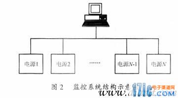 主從總線1∶N通信方式可以采用多種通信協(xié)議實現(xiàn)總線使用權的分配,本系統(tǒng)中使用的地址查詢方式,主從總線1∶N通信方式的監(jiān)控系統(tǒng)結構示意圖如圖2所示。系統(tǒng)給每個電源分配唯一的一個地址號,計算機分配一個固定的地址號。當計算機需要和某臺電源建立通信時,計算機發(fā)出一個含有該電源地址號的請求命令包。掛在總線上的所有電源一直處于等待接收數(shù)據(jù)狀態(tài),計算機所發(fā)出的請求命令包將被所有的電源所接收。每個電源將接收到的請求命令包中所包含的電源地址號與本模塊的地址號相比較,只有地址號與計算機所發(fā)出的請求命令包中所包含的地址號相同的電源才與計算機建立通信,響應計算機所發(fā)出的請求命令。其它地址號不相同的電源將拒絕響應計算機的請求命令,繼續(xù)保持接收數(shù)據(jù)狀態(tài),等待響應計算機發(fā)出的下一個請求命令包。系統(tǒng)中的這種地址查詢方式實現(xiàn)了任何時候總線上最多只有一臺電源與計算機通信,其它電源處于等待接收數(shù)據(jù)狀態(tài),從而有效地避免了總線使用權的沖突。