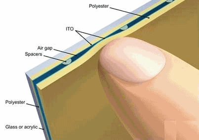相反地,這種技術(shù)的主要缺點(diǎn)源于觸控屏幕的多層結(jié)構(gòu)。其基層一般是玻璃,表面涂有一層均勻的ITO,頂層通常由聚乙烯對苯二甲酸酯(PET)制造,內(nèi)表面(Inner Surface)也涂有一層均勻的ITO,而外表面(Outer Surface)則有硬涂層,以為保護(hù)作用,而形成空氣隙以把這些導(dǎo)電層隔離開的細(xì)小透明間隔點(diǎn)常在打印制程中產(chǎn)生。這種多層材料堆棧的多層結(jié)構(gòu)對透光性有所影響,一般將降至約透明玻璃透光率的75%,同時(shí),空氣間隙可能產(chǎn)生薄霧效應(yīng),進(jìn)一步降低清晰度。此外,這種結(jié)構(gòu)很容易刮傷損壞,而且因?yàn)闄C(jī)械軸性不重合,還須仔細(xì)校準(zhǔn)以確定X、Y坐標(biāo)范圍,其它弱點(diǎn)還包括可能吸收電氣噪聲,尤其是來自液晶顯示器(LCD),這時(shí)一般須進(jìn)行濾波,將導(dǎo)致反應(yīng)時(shí)間的延長,當(dāng)然,控制器一次只能處理一個(gè)觸摸位置,也是一大局限。