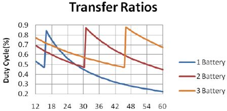 圖4:多個(gè)電池降壓和升壓模式之間的傳遞比[page]