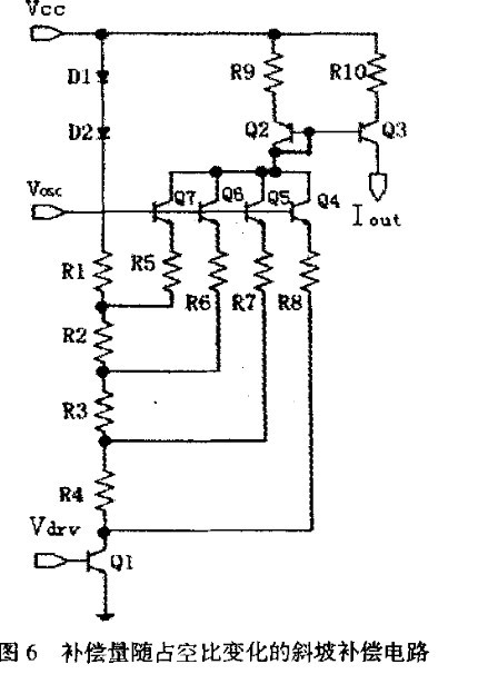 因為 Q4 ,Q5,Q 6和Q7是先后開啟的,所以補償電流在時間軸上的斜率dlout/dt將隨著Vosc的增大而增大,即斜坡補償?shù)牧侩S占空比增大而增大。