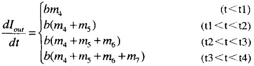 圖7是在選取了元件尺寸后計算機仿真波形。其中Vosc是理想化的鋸齒波,Iout是輸出的補償電流,IQ4、IQ5、IQ6、 IQ7分別是Q4, Q5, Q6和Q7的漏極電流,可以看到,為了在占空比小于50%的時候系統(tǒng)更加穩(wěn)定,Q4在每個周期開始時就已經(jīng)開啟,但是電流的斜率較小。隨著Vosc以恒定的斜率上升,將先后在t1, t2, t3時達(dá)到Q5, Q6和07的開啟點。設(shè)Q4, Q5, Q6, Q7開啟后的電流斜率分別為m4, m5, m6和m7,