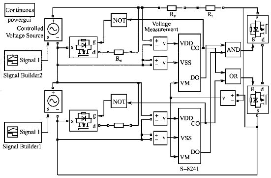 根據(jù)上述均衡充電保護(hù)板電路工作的基本原理,在Matlab/Simulink環(huán)境下搭建了系統(tǒng)仿真模型,模擬鋰電池組充放電過程中保護(hù)板工作的情況,驗證該設(shè)計方案的可行性。為簡單起見,給出了鋰電池組僅由2節(jié)鋰電池串聯(lián)的仿真模型,如圖5所示。