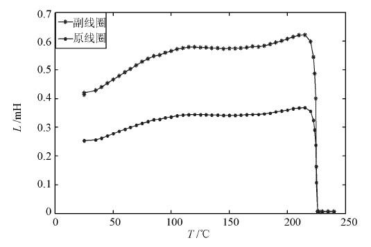 變壓器在中不僅能傳遞能量,同時(shí)還起到了電氣隔離的作用,變壓器的原邊與副邊線圈匝數(shù)比的不同可以達(dá)到升壓或降壓的作用。在模塊工作狀態(tài)下,由于磁芯的渦流效應(yīng),變壓器會(huì)產(chǎn)生很多的熱量,成為模塊熱量產(chǎn)生的主要來源。實(shí)驗(yàn)中首先測試了變壓器原邊和副邊線圈的電感量隨溫度的變化,如圖3 所示,從圖3 中可見隨著溫度的升高,線圈的電感量先增加,然后小幅下降,再小幅上升,在環(huán)境溫度為220℃ 以前,變壓器的原邊與副本電感量的整體趨勢是逐漸增加,當(dāng)溫度達(dá)到220℃,磁芯溫度達(dá)到居里點(diǎn),線圈的電感量迅速降為零。對于不同磁芯材料的變壓器其居里點(diǎn)溫度有所不同,對于此類變壓器,可知居里溫度在220℃附近。當(dāng)變壓器溫度接近居里點(diǎn)時(shí),變壓器電感量會(huì)迅速減小,會(huì)導(dǎo)致輸出電壓迅速下降。
