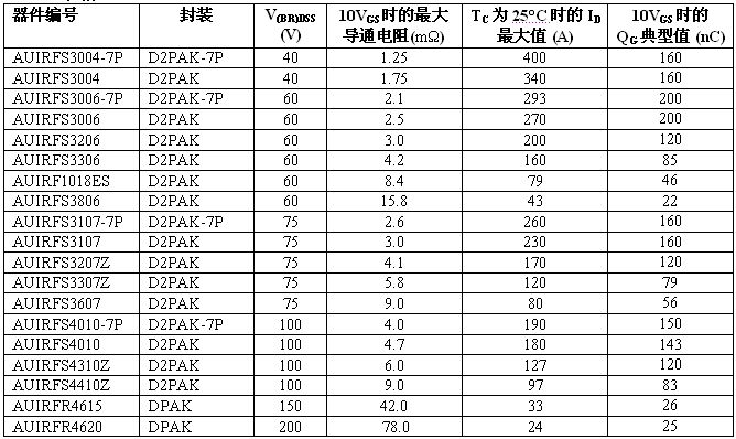 全新溝道 HEXFET 功率 MOSFET 系列采用多款表面貼裝器件 (SMD) 封裝,電壓范圍從 40V 至 200V。標準和邏輯電平柵級驅動 MOSFET 都為 IR 車用塑料封裝 MOSFET 產(chǎn)品系列設定了導通電阻性能新標準?;鶞蕦娮柙?40V 下最大為 1.25 毫歐,60V 下最大為2.1 毫歐,75V 下為 2.6 毫歐,100V 下為 4.0 毫歐。在 D2Pak-7P 封裝中許多器件的最大額定電流達 240A。