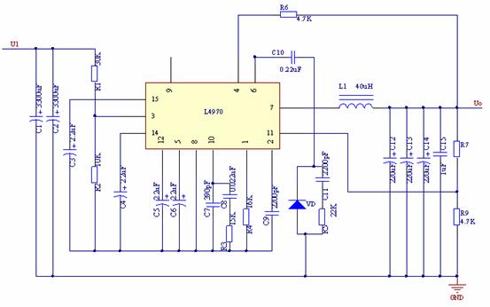 L4970A芯片的輸出電壓設(shè)定為10.8V,其輸出電阻R7由下式確定: