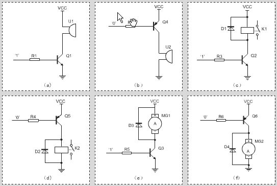 選用NPN 型、還是PNP 型晶體管驅(qū)動負(fù)載,要看設(shè)計者的要求。如圖1(a)、(c)、(e)是使用NPN 型晶體管驅(qū)動負(fù)載的電路,高電平“1”可以控制晶體管導(dǎo)通(負(fù)載通電)、低電平“0”使晶體管截止(負(fù)載斷電)。而圖1(b)、(d)、(f)是使用PNP 型晶體管驅(qū)動負(fù)載的電路,導(dǎo)通條件剛好相反。