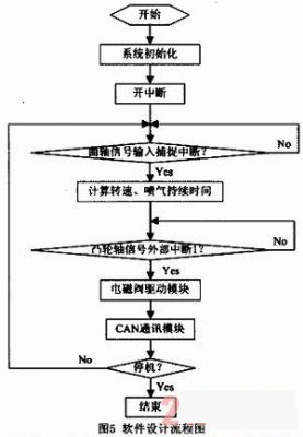 氣動發(fā)動機電控系統(tǒng)中,經(jīng)處理電路處理過的曲軸位置和凸輪軸位置信號,接到ICP1和INT1引腳。當相應電平變化時就會觸發(fā)曲軸、凸輪軸中斷。凸輪軸中斷子程序主要是用來判斷壓縮上止點位置的。在曲軸中斷函數(shù)中,完成發(fā)動機轉速計算,確定噴氣定時,以及結合油門位置信號的AD轉換值計算噴氣量等,并通過PA7引腳輸出信號控制執(zhí)行模塊。