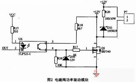 圖2所示的是電磁閥功率驅動模塊。其中,P7插座連接高速電磁閥,電磁閥線圈一端連接電源,另一端連接場效應管漏極。Q1是場效應管IRF540,起放大作用。U6是可控制的光電耦合器件TLP521-1,它廣泛應用于電路之間的信號傳輸,將ECU與負載隔離,可以增加電路的安全性,減小電路干擾,簡化電路設計。當ECU發(fā)出驅動信號,光耦導通,穩(wěn)壓二極管D10將場效應管Q1的柵極電壓穩(wěn)定在12V,漏極電流增大,漏極電壓被拉低。此時,電磁閥線圈電流增大,線圈產(chǎn)生強大的電動勢,電磁閥被打開。而當光耦截止時,電磁閥關閉,線圈中電路變化很大,會產(chǎn)生反電動勢。R20功率電阻和D11肖特基二極管IN5819與電磁閥并聯(lián),防止場效應管被擊穿。