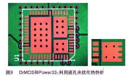 至于版圖布局,金屬較多顯然很有助益。更厚的頂層有助于降低溫度,不過(guò)也許對(duì)PCB的其余部分并不適合,因?yàn)槌杀驹黾恿?,其它元件需要的更精?xì)的間距也不可能實(shí)現(xiàn)。更大的銅面積很有用,但又會(huì)消耗PCB空間。這些應(yīng)該盡可能由焊料覆蓋,因?yàn)榻饘俦砻姹韧科岜砻娴纳嵝愿?。在多層PCB中,有時(shí)利用內(nèi)層來(lái)協(xié)助散熱。熱通孔(填充焊料)有時(shí)可用來(lái)把熱量擴(kuò)散到PCB的另一面去(圖9)。