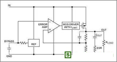 RF電路分為接收和發(fā)送兩部分,供電電壓典型值為2.6V至3.0V,其中低噪聲放大器(LNA)、混頻器、鎖相環(huán)(PLL)、壓控振蕩器(VCO)和中頻(IF)電路需要低噪聲、高PSRR的LDO。實際應用中,VCO、PLL電路的性能直接影響射頻電路指標,如發(fā)射頻譜的純度、接收器的選擇性、模擬收發(fā)器的噪聲、數字電路的相位誤差等。噪聲會改變振蕩器的相頻和幅頻特性,同時振蕩器環(huán)路也會進一步放大噪聲,可能對載波產生調制。LDO輸出噪聲受其內部設計和外部旁路、補償電路的影響。如圖是線性穩(wěn)壓器的簡單框圖。導致LDO輸出噪聲的主要來源是基準