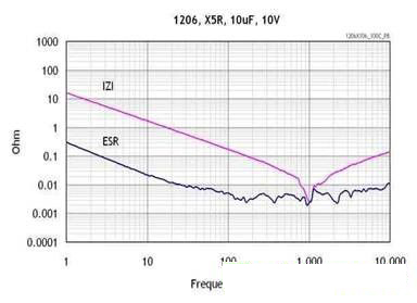 LDO需要增加外部輸入和輸出電容器。利用較低ESR的大電容器一般可以全面提高電源抑制比(PSRR)、噪聲以及瞬態(tài)性能。陶瓷電容器通常是首選,因為它們價格低而且故障模式是斷路,相比之下鉭電容器比較昂貴且其故障模式是短路。輸出電容器的等效串聯電阻(ESR)會影響其穩(wěn)定性,陶瓷電容器具有較低的ESR,大概為10 mΩ量級 采用陶瓷電容時,建議使用X5R 和X7R電介質材料,這是因為它們具有較好的溫度穩(wěn)定性。圖為X5R的ESR和頻率曲線。