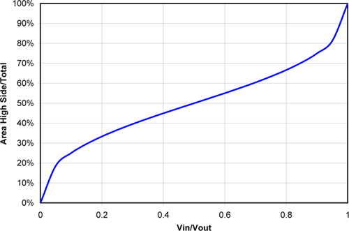 通過圖1,我們知道 50% 轉(zhuǎn)換比率時出現(xiàn)最佳傳導(dǎo)損耗極值。但是,在其他轉(zhuǎn)換比率條件下,可以將損耗降至這一水平以下。附錄 1 給出了進(jìn)行這種優(yōu)化的數(shù)學(xué)計算方法,而圖 2 顯示了其計算結(jié)果。即使在極低的轉(zhuǎn)換比率條件下,F(xiàn)ET 芯片面積的很大一部分都應(yīng)該用于高側(cè) FET。高轉(zhuǎn)換比率時同樣如此;應(yīng)該有很大一部分面積用于低側(cè)。這些結(jié)果是對這一問題的初步研究,其并未包括如高側(cè)和低側(cè)FET之間的各種具體電阻值,開關(guān)速度的影響,或者對這種芯片面積進(jìn)行封裝相關(guān)的成本和電阻等諸多方面。但是,它為確定 FET 之間的電阻比提供了一個良好的開端,并且應(yīng)會在FET選擇方面實(shí)現(xiàn)更好的整體折中。