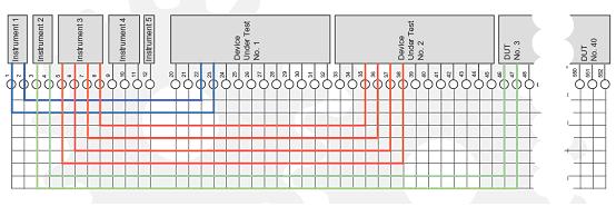 可以選擇另一種方式對矩陣進(jìn)行配置,這種方式可以得到更為高效,并且Pickering公司的BRIC也非常適用在這種方式中。前面提到的矩陣構(gòu)成方式是,將測試裝置和Y向進(jìn)行連接,將待測設(shè)備的接入點(diǎn)和X向進(jìn)行連接,下面我們采用另一種方式重新對矩陣進(jìn)行排列,將所有的測試裝置以及待測設(shè)備的接入點(diǎn)都和X軸向進(jìn)行連接。而Y軸則是將X軸方向上的不同設(shè)備進(jìn)行相互連接。盡管在許多應(yīng)用中,如果PXI的前面板上有需要的話,Y軸是可用的,但是Y軸的輸出并沒有用到。