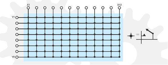 實(shí)現(xiàn)開關(guān)切換的一個(gè)比較通用的方法就是采用交叉點(diǎn)開關(guān)或矩陣排列來實(shí)現(xiàn)。在矩陣開關(guān)中,一系列的橫向(X軸方向)和縱向(Y軸方向)線路在每個(gè)交叉點(diǎn)上相互連接著。開關(guān)最簡單的結(jié)構(gòu)是,在通常的狀態(tài)下是常開的,而在上電后則斷開連接,形成閉合狀態(tài),但是,也可能存在其他的結(jié)構(gòu)。開關(guān)允許矩陣中任何橫向線路與縱向線路在任意點(diǎn)的連接。