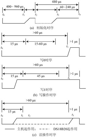 (1)初始化時(shí)序。時(shí)序見圖2(a),主機(jī)總線t0時(shí)刻發(fā)送一復(fù)位脈沖(最短為480s的低電平信號)接著在t1時(shí)刻釋放總線并進(jìn)入接收狀態(tài),DS18B20在檢測到總線的上升沿之后等待15~60μs,接著DS18B20在t2時(shí)刻發(fā)出存在脈沖(低電平持續(xù)60~240s),如圖中虛線所示。