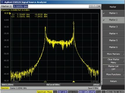 另一種方法:將低頻方波直流耦合至電源內(nèi),同時觀察VCO頻譜任一側(cè)上的頻移鍵控 (FSK)調(diào)制峰值(圖2)。峰值間頻率偏差除以方波幅度,便得出VCO推壓系數(shù)。該測量方法比靜態(tài)直流測試更精確,因為消除了與直流輸入電壓變化相關(guān)的任何熱效應(yīng)。圖2顯示ADF4350 VCO輸出在3.3 GHz、對標(biāo)稱3.3 V電源施加10 kHz、0.6 V p-p方波時的頻譜分析儀曲線圖。對于1.62 MHz/0.6 V或2.7 MHz/V的推壓系數(shù),最終偏差為3326.51 MHz – 3324.89 MHz = 1.62 MHz.該結(jié)果可與表1中的靜態(tài)測量 2.3 MHz/V比較。
