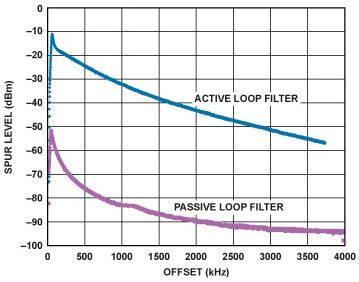 電荷泵將鑒相器誤差電壓轉(zhuǎn)換為電流脈沖,并通過PLL環(huán)路濾波器進(jìn)行積分和平滑處理。電荷泵通??稍谧疃嗟陀谄潆娫措妷海╒P)0.5 V的電壓下工作。例如,如果最大電荷泵電源為5.5 V,那么電荷泵只能在最高5 V輸出電壓下工作。如果VCO需要更高的調(diào)諧電壓,則通常需要有源濾波器。有關(guān)實際PLL的有用信息和參考設(shè)計,請參見電路筆記CN-0174,5,處理高壓的方式請參見利用高壓VCO設(shè)計高性能鎖相環(huán),"6該文章發(fā)表于模擬對話第43卷第4期(2009)。有源濾波器的替代方案是使用PLL和針對更高電壓設(shè)計的電荷泵,例如ADF4150HV ADF4150HV可使用高達(dá)30 V的電荷泵電壓工作,從而在許多情況中省去了有源濾波器。