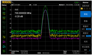 圖三:通過(guò)不同顏色的跡線清晰觀察比較改變RBW后的頻譜變化