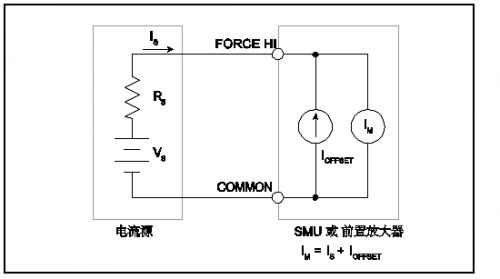 對(duì)于理想的安培計(jì),當(dāng)其輸入端子保持開路時(shí),其讀數(shù)應(yīng)為零。然而,現(xiàn)實(shí)中的安培計(jì)在輸入開路時(shí)確實(shí)存在小電流。這一電流被稱為輸入偏移電流,是由于有源器件的偏置電流以及流過儀器中絕緣體的漏泄電流產(chǎn)生的。SMU內(nèi)產(chǎn)生的偏移電流已包括在吉時(shí)利4200-SCS型的技術(shù)指標(biāo)中。如圖1所示,輸入偏移電流增加至被測(cè)電流,所以儀表測(cè)量的是兩個(gè)電流之和。