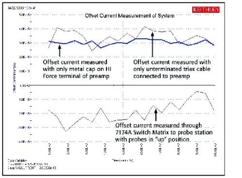將系統(tǒng)配置為進(jìn)行超低電流測(cè)量的前幾步之中有一步是確定整個(gè)測(cè)量系統(tǒng)的偏移和漏泄電流,包括4200-SCS本身、連接電纜、開關(guān)矩陣、測(cè)試夾具和探針。這可確定整個(gè)系統(tǒng)的噪底限值,并設(shè)置一個(gè)開始點(diǎn),如果可能的話則進(jìn)行改進(jìn)。從測(cè)量源測(cè)量單元(SMU)的偏移開始,然后繼續(xù)增加測(cè)量電路組件,直到連接了除被測(cè)裝置(DUT)之外的全部組件。直接由帶有4200-PA遠(yuǎn)程前置放大器的4200-SMU利用KITE軟件進(jìn)行測(cè)量。