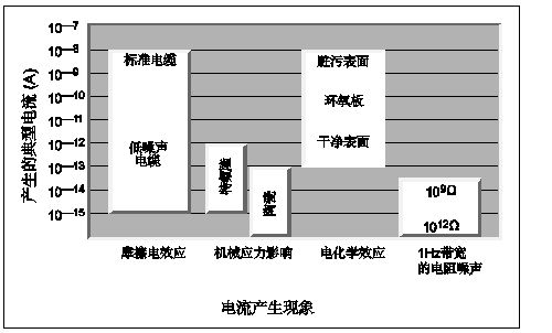確定了電流偏移、漏流及所有不穩(wěn)定性后,采取措施減小測(cè)量誤差將有助于提高測(cè)量準(zhǔn)確度。這些誤差源包括建立時(shí)間不足、靜電干擾、漏泄電流、摩擦效應(yīng)、壓電效應(yīng)、污染、濕度、接地環(huán)路,以及源阻抗。圖5中匯總了本節(jié)討論的部分電流的幅值。