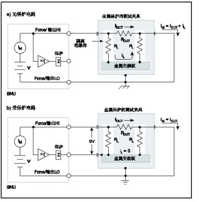 在圖11b中,金屬安裝板被連接至SMU的保護(hù)端子。隔離絕緣體頂部和底部的電壓接近相同電勢(shì)(0V壓降),所以在隔離絕緣體中就不會(huì)有漏流影響測(cè)量準(zhǔn)確度。由于金屬安裝板將處于保護(hù)電勢(shì),所以為安全起見,金屬屏蔽必須連接至地。