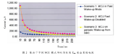 可以很清晰地看到,方法2(b)的設(shè)置無論如何都需要最大電流,因此對于車門模式來說,它不是最好的解決方案。方法2(a)為Tsum提供了小于180ms的最低電流消耗。只要Tsum不大于180ms,關(guān)閉MCU電源執(zhí)行SBC定期喚醒的方法1將是最大程度降低功耗的最佳選擇。