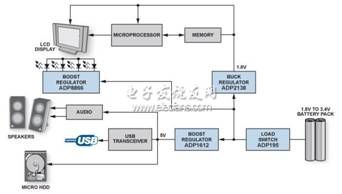 圖1顯示采用兩節(jié)串聯(lián)的AA電池供電的典型低功耗系統(tǒng)。電可用輸出范圍約為1.8 V至3.4 V,而IC工作時需要1.8 V和5.0 V 電壓。升壓轉(zhuǎn)換器可在不增加電池單元數(shù)量的情況下提升電壓,從而為WLED背光、微型硬盤驅(qū)動器、音頻設(shè)備和USB外設(shè)供電,而降壓轉(zhuǎn)換器可為微處理器、內(nèi)存和顯示器供電。