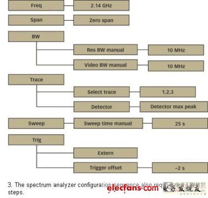 正如已經(jīng)提到的一樣,頻譜分析器在“零檔”模式下使用。不論是分辨率帶寬還是視頻帶寬,均設(shè)為10MHz,因?yàn)轭l譜分析器被用來測量峰值功率。基于同樣的理由,檢測器必須在“最大峰值”模式下設(shè)置。選取25s的掃描時間以便獲得對屏幕的整體掃描。選擇外部觸發(fā)器的可選項(xiàng)。利用“觸發(fā)器偏差”特性將屏幕上的軌跡置于中心也是一種明智的選擇。-2s即是合適的。圖3顯示了詳細(xì)的配置序列。