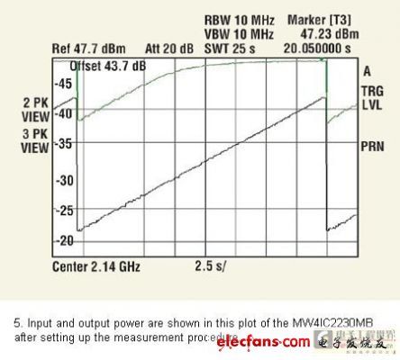 用于頻譜分析器的功能序列顯示在圖4中。此刻,頻譜分析器連接到輸入,且輸入功率在第二條線跡(線跡2)獲取,并保持在“觀察”模式。圖5中的黑色線跡即得。當(dāng)在輸出再連接分析器之后,從第三條線跡(線跡3)獲得輸出功率,同樣也保持在“觀察”模式。通過設(shè)置“輸出偏差”值的參數(shù)等級偏差,該值在校準(zhǔn)階段被設(shè)為43.7dB,從“線跡3”可以直接讀取以dBm為單位的絕對輸出功率,圖5中的綠線即得。通過在鋸齒末端的平面區(qū)域安置標(biāo)記,可以讀取如圖5 中綠線所示的飽和功率。MW4IC2230MB顯示+47.23dBm的飽和功率。