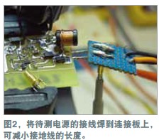 在測量電源軌的紋波時,必須盡量減小噪聲,因為紋波幅度可能很小。示波器探頭是基本的測量工具,但它們可能引入噪聲與誤差。地線(如與標準示波器探頭連接的那根線)可能增加一些不會出現(xiàn)在示波器軌跡上的電路噪聲。線路環(huán)就像一根天線,會提取周圍的雜散磁場。環(huán)路面積越大,提取的噪聲就越多。為證明這個理論,可將示波器地線連接到探頭尖端,然后到處移動。示波器會隨著地線的移動而顯示出噪聲的增減。用一個示波器探頭及其地線和插座可以做一個簡單的連接板(圖1)。