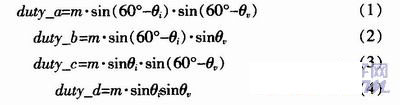 以虛擬整流器、逆變器均工作在第一扇區(qū)為例,相量合成的固定空間電流、電壓相量分別是I6、I1和U6、U1,兩個空間相量的綜合調制采用相互嵌套的辦法來實現。整個輸入相電流和輸出相電壓相量合成共有I6-U6、I6-U1、I1-U6、I1-U1、I0-U0 5種組合。每一相量組合的作用時間用占空比duty來表示。等式(1~5)反映了占空比的計算公式。占空比可以通過表1來分配給相應的開關組合。
