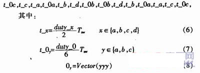 空間矢量調制法只確定開關間隔中應用電壓矢量的占空比,從而獲得低頻率的輸出電壓和輸入電流的平均值,但是并沒有確定使用的順序。所以需要使用雙空間矢量調制法,同時也可改善波形的質量。圖2表明了輸入電流在4扇區(qū),輸出電壓在5扇區(qū)應用雙空間矢量調制的順序。電壓矢量在開關間隔中對稱分布,零矢量每4個開關間隔使用一次。在每次開關轉換中只有一個開關狀態(tài)發(fā)生改變以最大程度地降低損耗。在圖2中通過表格2確定相應開關時間: