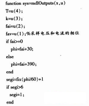 盡管現有的DSP技術和FPGA技術處理速度很快,很有效,但矩陣變換器的控制仍非常復雜,在仿真中,若按傳統(tǒng)方法使用定義好的Simulink模塊,會非常繁瑣,因為必須正確的設置大量的參數,而又沒有合適的調試工具。通過Matlab/Simulink里的功能強大的S函數,S函數完美地結合了Simulink框圖簡潔明快的特點和Matlab編程靈活方便的優(yōu)點,可充分利用Matlab提供的豐富資源,調用各種工具箱函數,實現模塊所無法實現的復雜功能,從而使問題大大簡化。編程中既可以使用C語言,也可以使用Matlab語言來實現空間矢量調制法。使用后者會更簡單些,以下是部分程序:
