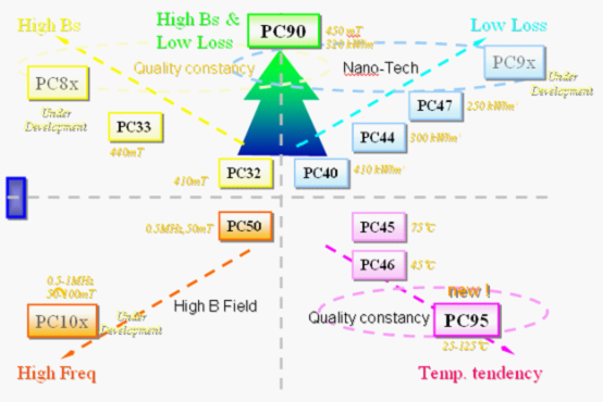 圖2:與其它材料,PC47有更高的飽和磁通密度和更低的損耗