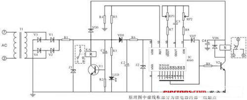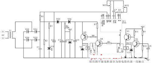該電路核心部分由IC4541構成,延時設定由RP2、C*設定,A-B端根據(jù)需求接相應高、低電平(設定端)內部2繞組閉鎖繼電器采用DC12V(因繼電器工作電壓與IC4060組成延時電器要低,則為保證其驅動則分別由V6、V7、V1、V3構成)。其中C2為二次儲能器件,可根據(jù)延時的長短予以調整,C4為完成S置位線圈工作。