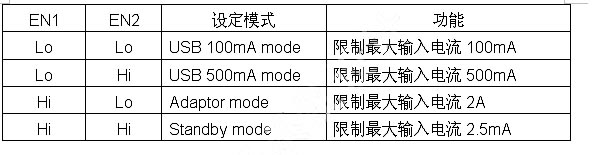 LD6275將電源適配器/USB埠的5V直流電源進行降壓穩(wěn)流,對鋰離子電池進行充電,為防止電源適配器的過電流超載,可以外部電阻RCISET設定最大充電電流限制。同時支援電腦USB埠充電模式,并依據(jù)外部腳位EN1與EN2進行設定,各模式請見表1.透過為USB 500mA與USB 100mA操作模式設定,可以保護PC端USB埠避免過載。