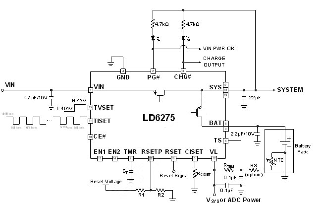 為滿足低耗電可攜式產品對于更精確、更安全的充電器應用需求,許多IC制造商發(fā)展出低成本線性充電器。圖2是以通嘉科技的LD6275充電IC為設計范例,構成僅需少數(shù)外部零件的獨立式線性充電器電路,其具備1.5A的最大充電電流。