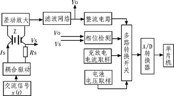給電池施加一個(gè)固定頻率和固定電流(日前一般使用l kHz頻率、50 mA小電沆),然后對(duì)其電壓進(jìn)行采樣,經(jīng)過整流、濾波等一系列處理后通過運(yùn)放電路計(jì)算出該電池的內(nèi)阻值。圖4為在線測(cè)量剩余電量硬件框圖。