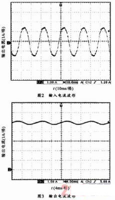 圖3所示為輸入220V,輸出滿載時(shí)的輸出電流波形。紋波電流峰峰值120mA,輸出電流中疊加有2倍市電供電頻率的紋波電流。