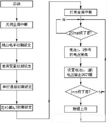 為了驗證本文的均衡充電方法,以兩節(jié)單體電池組成的蓄電池組為例進行實驗和分析,主要驗證旁路中開關管對電壓的調節(jié)作用??刂屏鞒桃妶D4。
