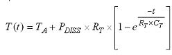在穩(wěn)態(tài)下,LEDI/NTC的ESD二極管的VF為-622mV,對(duì)應(yīng)結(jié)溫 95.2℃(環(huán)境溫度為25℃時(shí))。在穩(wěn)定狀態(tài)下,測(cè)得的PFET導(dǎo)通電阻為154mΩ,對(duì)應(yīng)結(jié)溫105℃。圖3 還描繪了LM3554的熱容。VF和RPMOS的響應(yīng)表現(xiàn)呈現(xiàn)類(lèi)似于一階RC的指數(shù)級(jí)上升,計(jì)算等式如下: