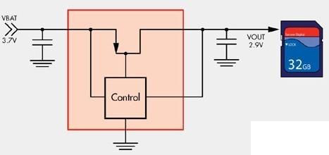 對(duì)于低速工作的小容量SD卡,耗電量常常小于100mA。假設(shè)鋰離子電池的額定工作電壓為3.7V,且存儲(chǔ)器的電源軌相當(dāng)高,則線性調(diào)節(jié)器就成為SD存儲(chǔ)器的電源選擇。不過(guò),選定的線性調(diào)節(jié)器必須能以低壓降(LDO)方式工作,因?yàn)殇囯x子電池的有效電壓范圍在3.2至4.2V之間。
