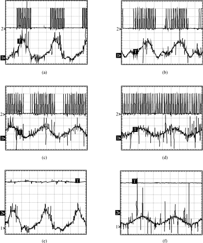 圖3(a)(b)(c)(d)示出了不同L、C參數(shù)時(shí)直流電源的控制脈沖和輸出電流。其中(a)為沒有LC濾波電路時(shí)的實(shí)驗(yàn)波形,(b)的濾波參數(shù)為L(zhǎng)=2mH、C=1100μF,(c)的濾波參數(shù)為L(zhǎng)=2mH、C=2200μF,(d)的波波參數(shù)為L(zhǎng)=2mH、C=3300μF。由圖可見,當(dāng)逆變器輸入側(cè)不加LC濾波器時(shí),直流電源輸出電流大范圍波動(dòng),造成控制脈沖時(shí)有時(shí)無。其結(jié)果是系統(tǒng)噪聲變大,整機(jī)效率下降,可靠性降低。隨著LC濾波參數(shù)的加大,逆變器輸入電流的波動(dòng)逐漸減小,控制脈沖逐漸變得連續(xù),系統(tǒng)噪音變小,效率變高。為了保證逆變器輸入電壓的穩(wěn)定,濾波電感不宜加的太大,增大濾波參數(shù)適宜加大濾波電容。