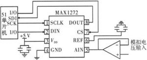 圖4中MAX1272采用了內(nèi)部參考電壓,6腳VREF 和地之間接2.2μF鉭電容和0.1μF陶瓷電容。