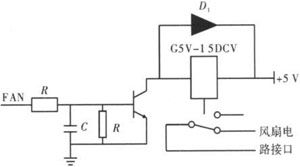 電路如圖6所示,F(xiàn)AN為低電平時,晶體管9014不導通,此時繼電器無動作;當FAN為高電平時,晶體管9014導通,使得繼電器觸點吸合,風扇在24V電源電壓的供電下開始工作。