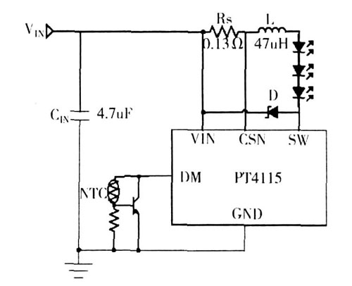 4) PT4115 內(nèi)部自帶過溫保護(hù)功能,外部過溫保護(hù)可設(shè),對LED 實現(xiàn)雙重保護(hù);